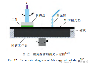 磁流變輔助拋光引入磁流變彈性體(MRE),與化學(xué)機(jī)械拋光相結(jié)合,在外加磁場、磁性拋光墊、氧化還原反應(yīng)的共同作用下,提高工件的材料去除率,降低表面粗糙度,實(shí)現(xiàn)對工件的超精密加工。磁流變輔助拋光示意圖如圖12所示。