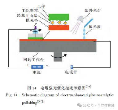 因此多個技術(shù)方向復(fù)合增效以達(dá)到化學(xué)氧化作用和機(jī)械去除作用同時(shí)提升的方法,引起了研究者的注意。比如,2019年,Y.He等人開發(fā)了一種用于4H-SiC晶圓Si面的電增強(qiáng)光催化拋光方法,如圖14所示。電流可以有效地防止半導(dǎo)體顆粒表面產(chǎn)生的電子與空穴的復(fù)合,從而提高拋光效率。以P25為光催化劑、H2O2為電子捕獲劑的拋光液拋光性能最好,MRR約為1180nm/h,在1.0μm×1.0μm范圍內(nèi),Ra約為0.053 nm。2019年,翟文杰等人對SiC進(jìn)行了超聲-電化學(xué)機(jī)械研拋實(shí)驗(yàn)。實(shí)驗(yàn)結(jié)果表明,在試件與拋光盤之間的電壓為+10V時(shí),材料去除率比無電壓時(shí)提高了55.1%;當(dāng)對試件施加超聲-電場作用后,材料去除率比無超聲時(shí)提高了91.7%。